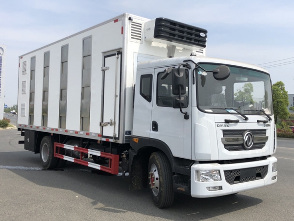底盘配置: 采用东风D9驾驶室,康机180马力发动(油耗值:27.8L/100km),轴距5200mm,小八档变速箱,空调,ABS,断气刹, 上装配置: 厢体尺寸7.4m,厢体恒温(箱体外玻璃钢2mm,内不锈钢材质1.0mm,中间聚氨酯挤塑板80mm,保温隔热),内部两层液压板+一层固定板共计3层板(每层隔板分配4个隔仓,每层层板上覆盖3mm铝花纹地板),尾部液压翻转液压伸缩加之左右两边附带栏杆,厢体前部带有隔仓(可加装电机,亦可做杂物间使用)。 1.喂食系统:每层配有4个咀水嘴,共计12个,并带有容积210L的奶罐,可实现水或液态食物的引用需求; 2.喷淋降温系统:每层配有4个喷头,共计12个,并带有容积200L的水罐; 3.污水收集系统:分布在车厢前部,厢体下部带有150L黑水箱; 4.监控系统:驾驶室配有温湿度记录仪以及高清监测操作系统,可在车子行进期间实现温控操作: 5.温控系统:厢体前部装配制凯利冷机组,隔舱内装有加热器; 6.排风系统:厢体四面通风,厢体两侧各装有18个百叶窗+左右3个排风扇,车厢前部及尾部也各配有排风扇及百叶窗,可在驾驶室内直接实现打开或关闭,并在车厢后部配有小型供电系统。 选装配置: 选装制冷机组(凯利、冷**等),空气过滤系统,水暖系统。 | |||